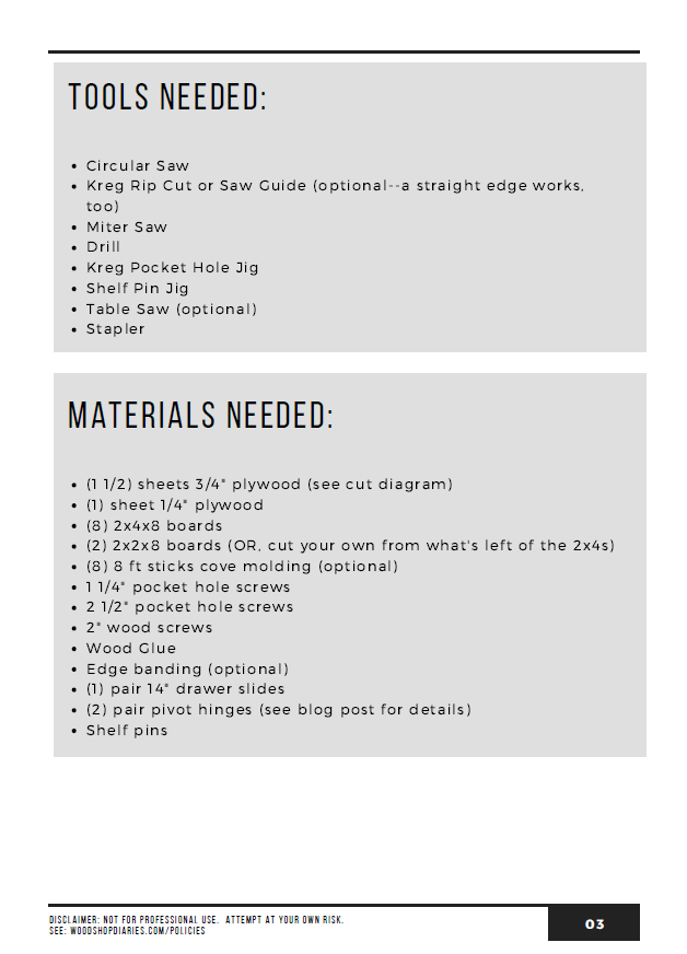 All plans include cut list, materials list, step by step instructions with 3D graphics, and most also have links to an accompanying tutorial as well.