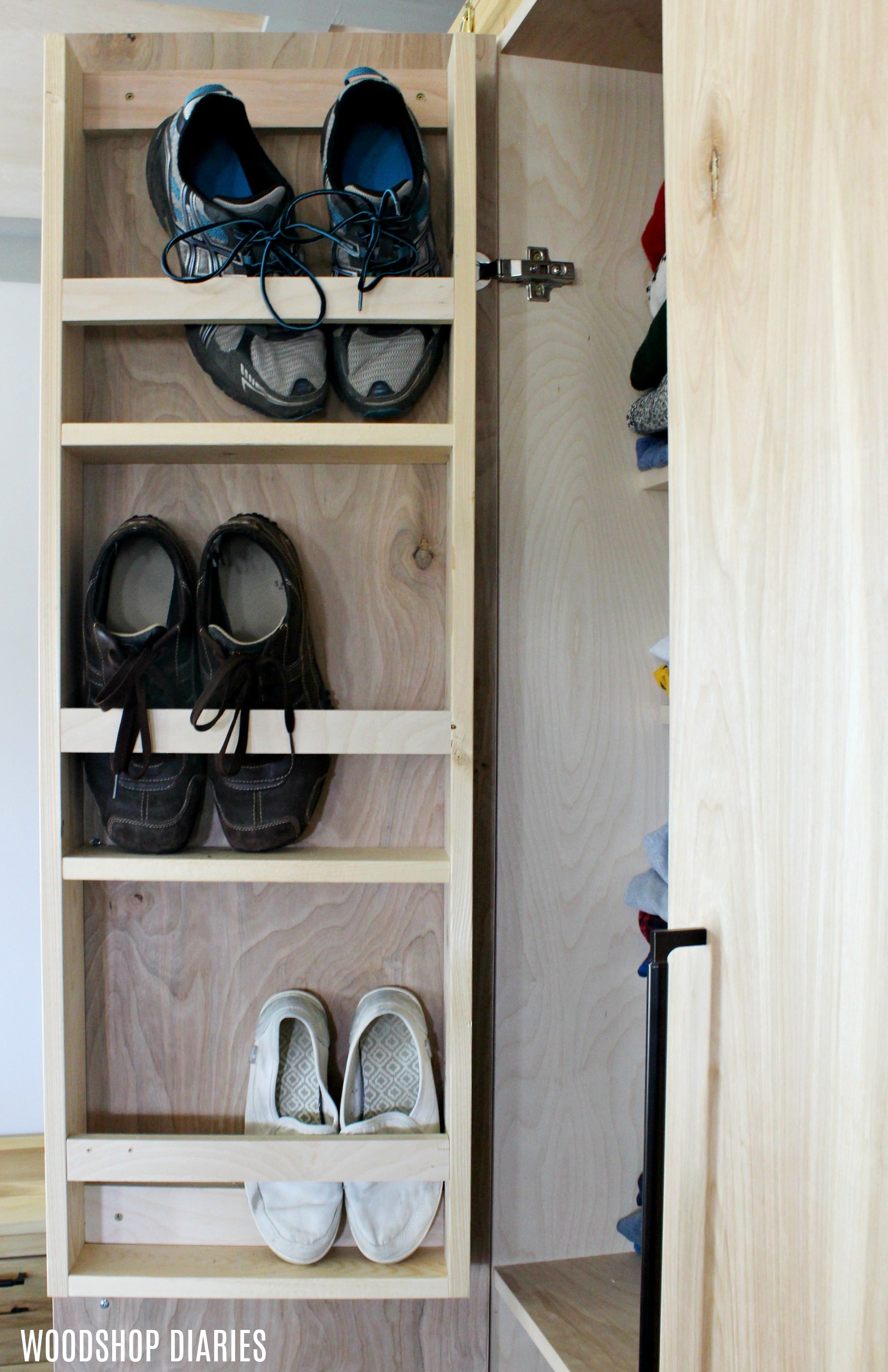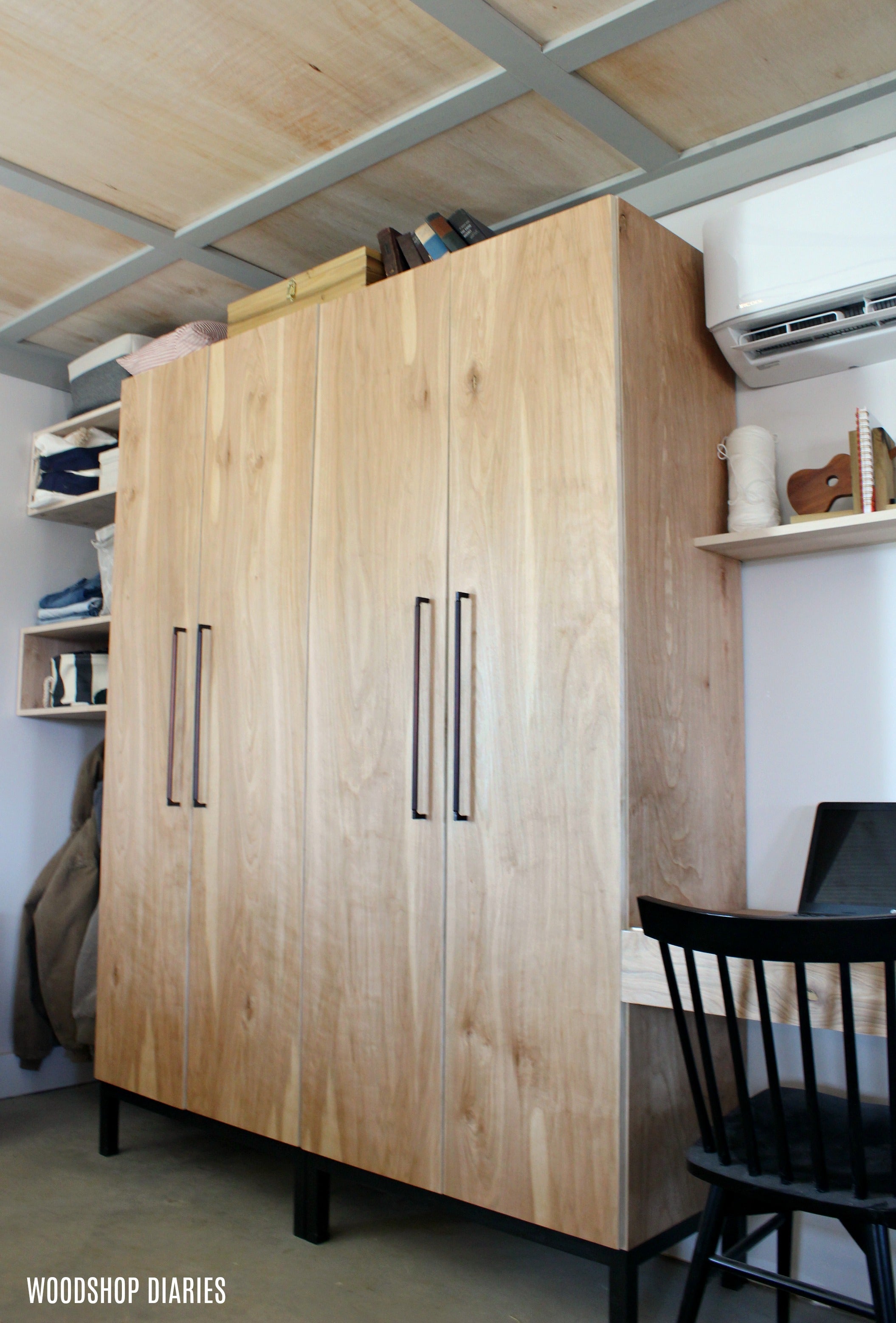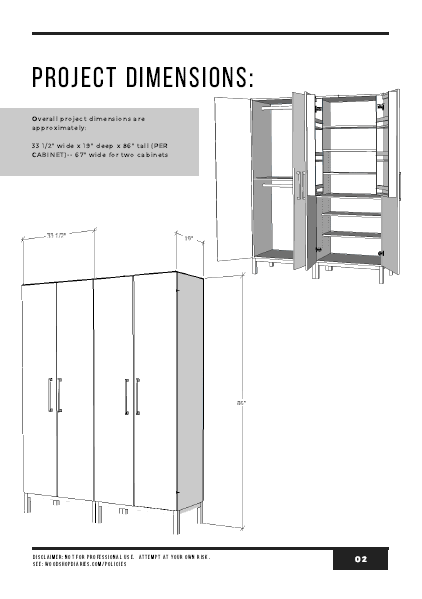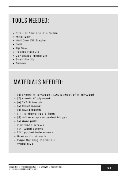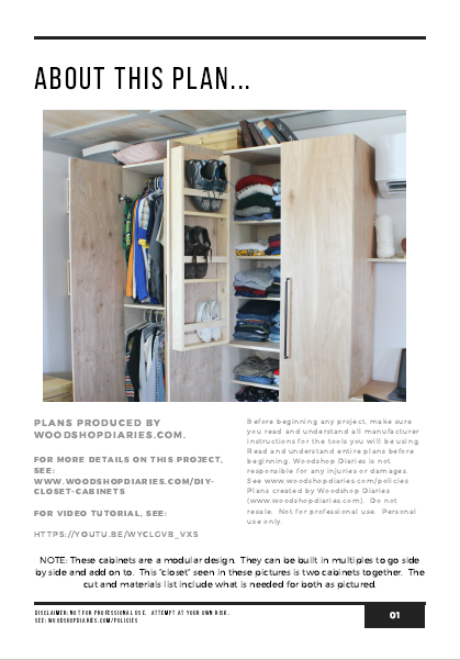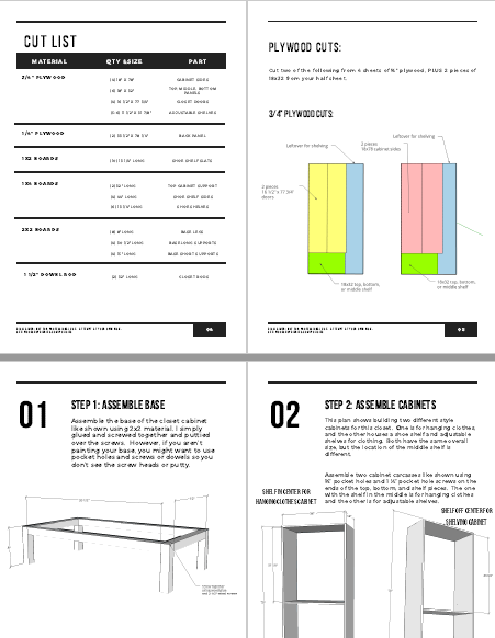 This printable PDF building plan shows you the step by step process to build these modular stand alone closet cabinets. All plans include cut list, materials list, step by step instructions with 3D graphics, and most also have links to an accompanying video tutorial as well.