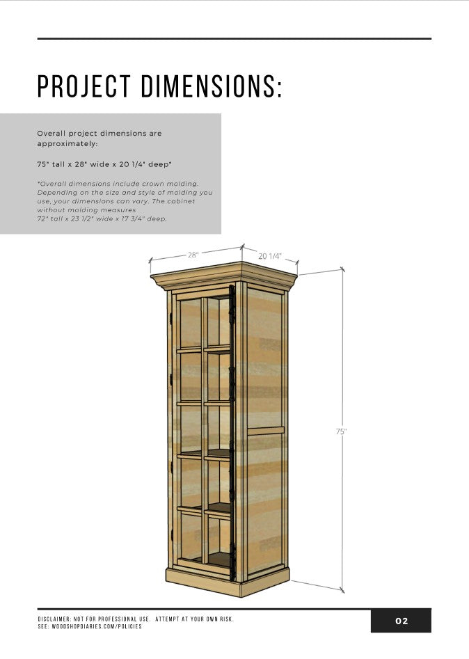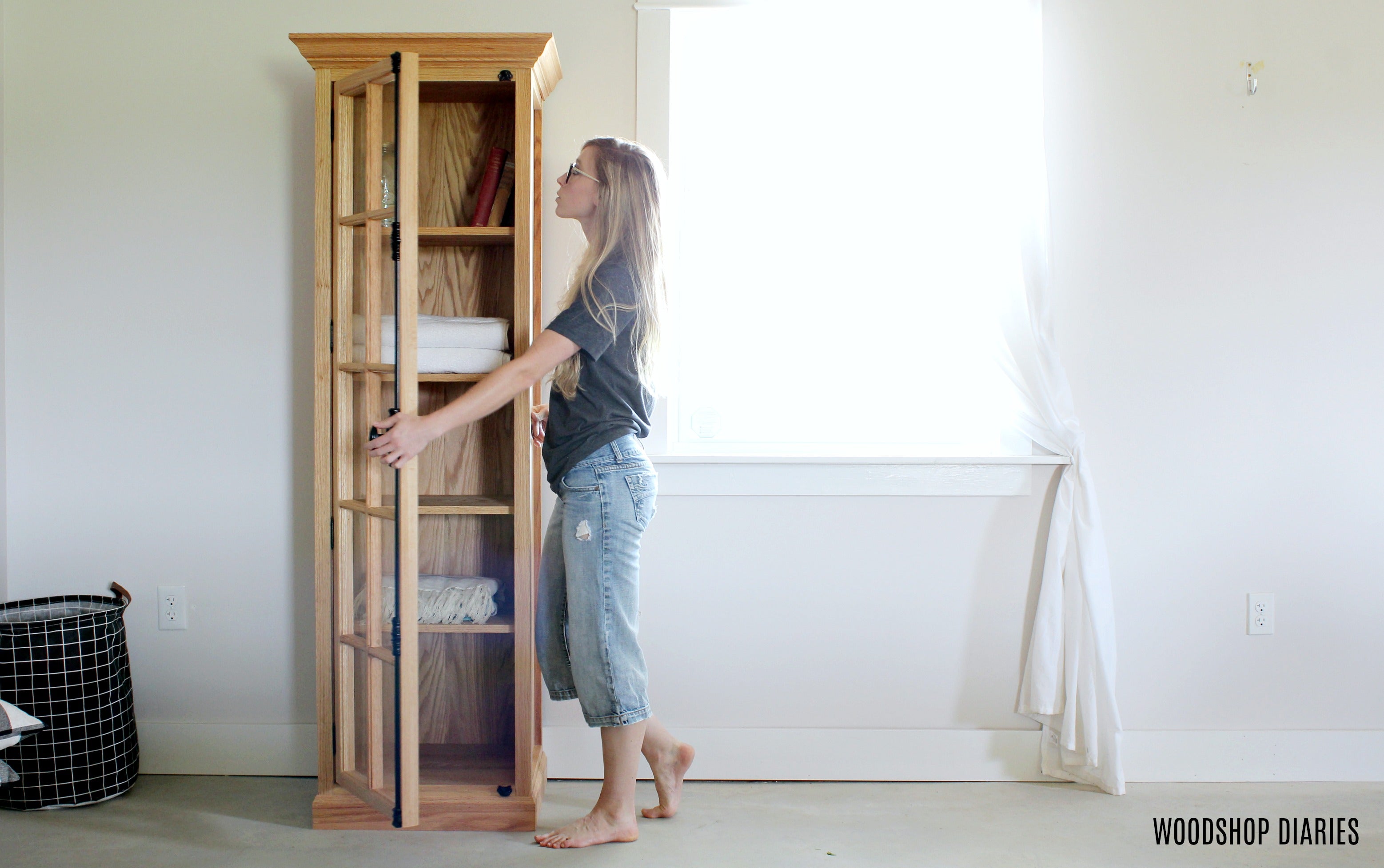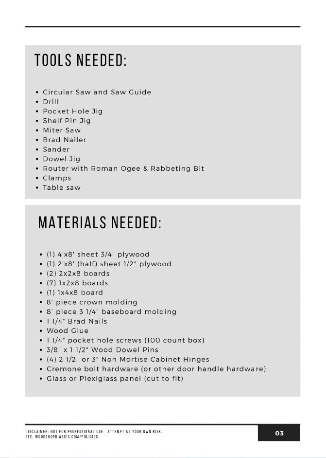 Ready to build a classy glass door linen or display cabinet? All you need is a plan! This printable PDF building plan contains the detailed cut list, 3D diagrams, and step by step instructions to build your own DIY linen cabinet.