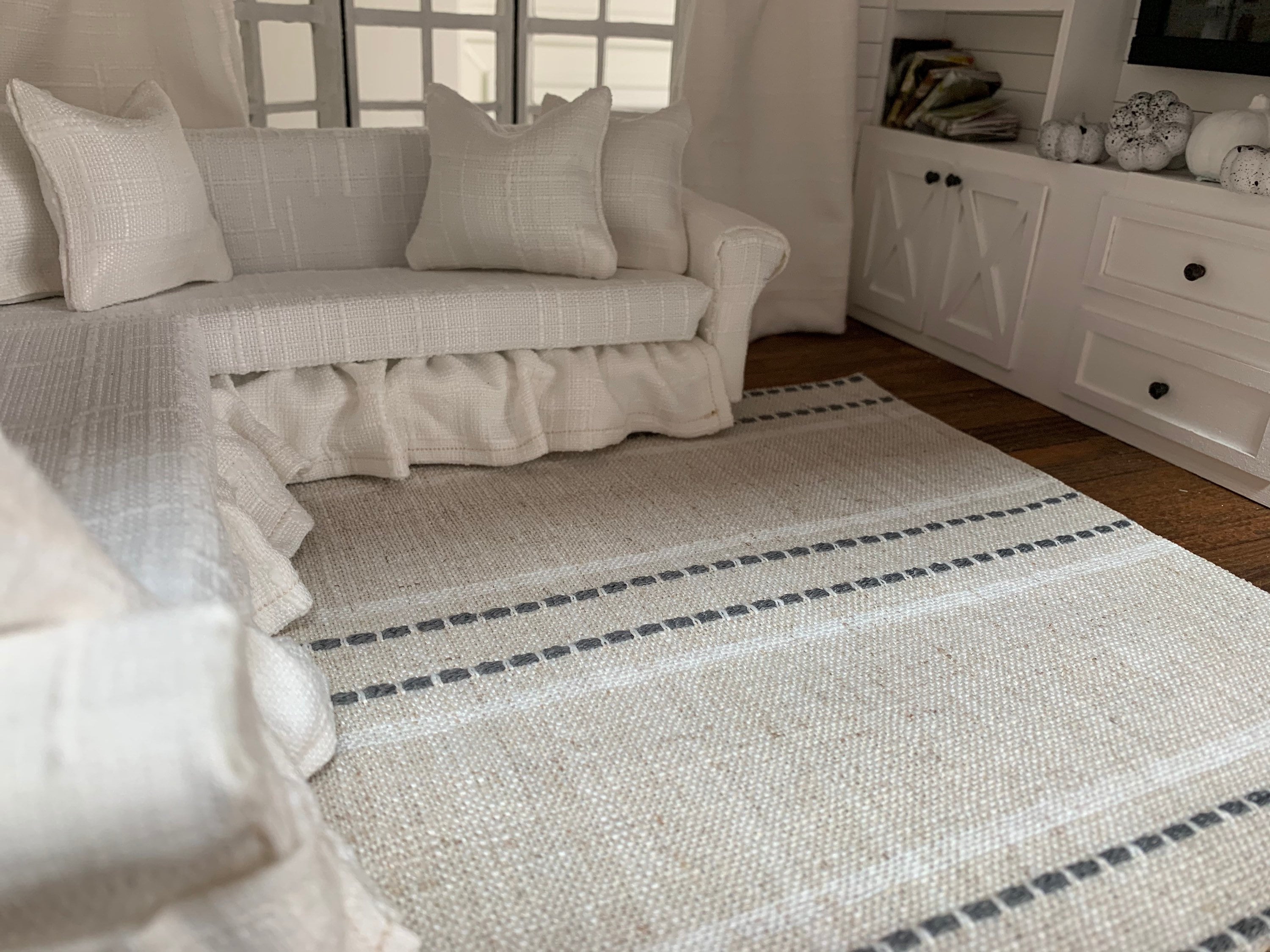 Dollhouse miniature area rug in a light tan woven pattern with charcoal and white lines. Add some warmth and texture to your living or dining room decor with this thick textured fabric. It comes in 4 standard sizes, but if you need a custom size, please message me.