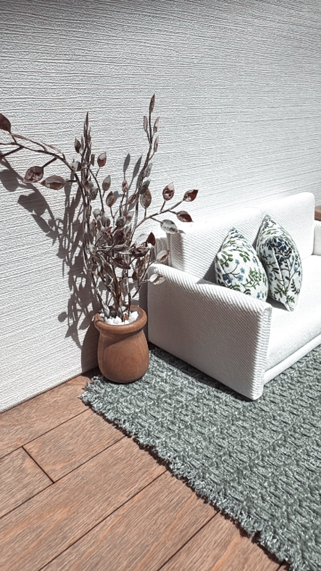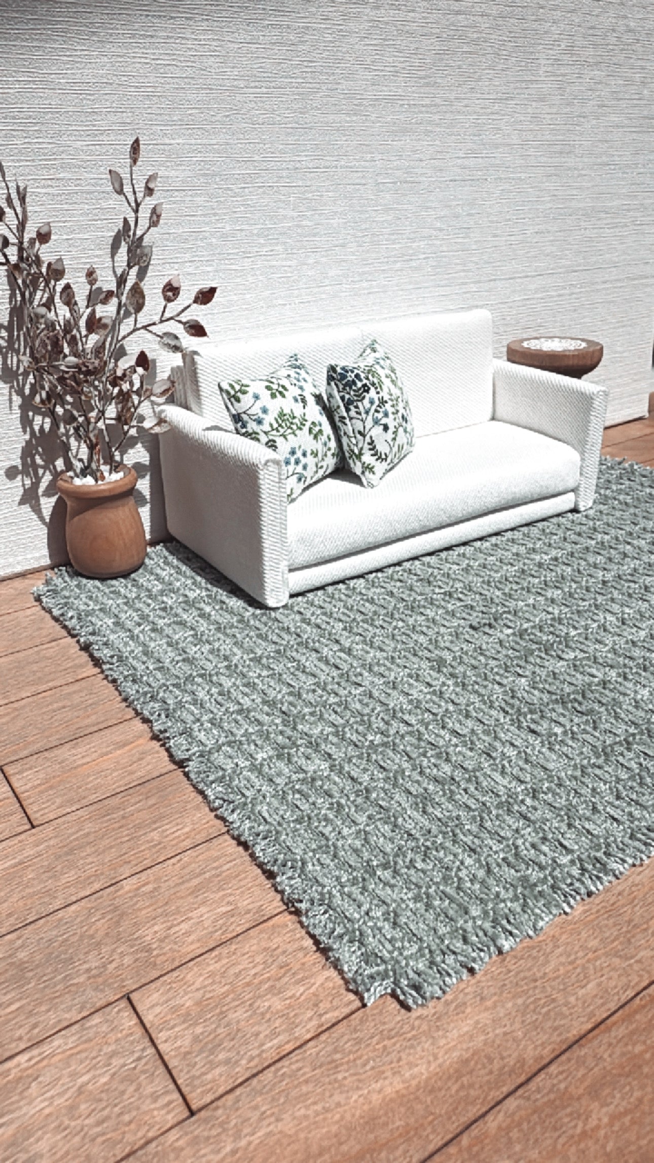 Dollhouse miniature area rug in a muted sage green woven pattern. Add some warmth and texture to your living or dining room decor with this neutral textured fabric.