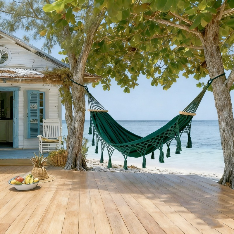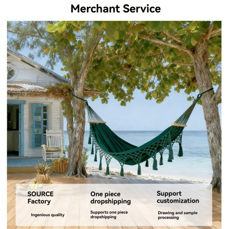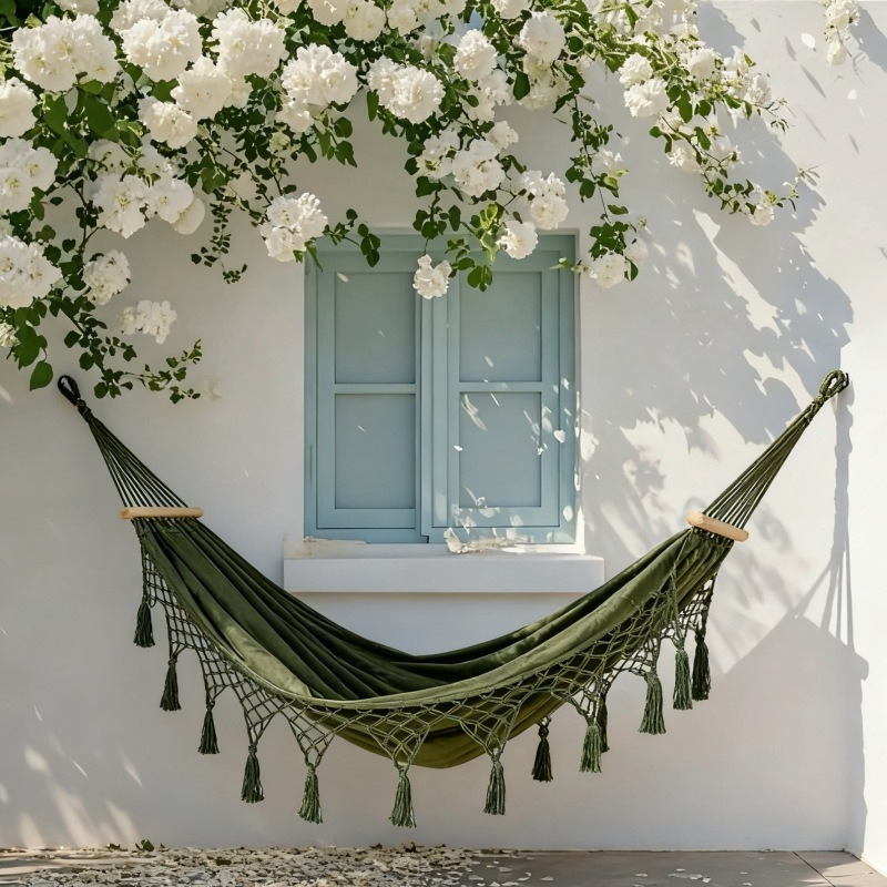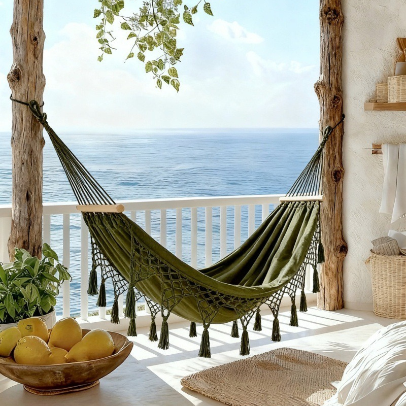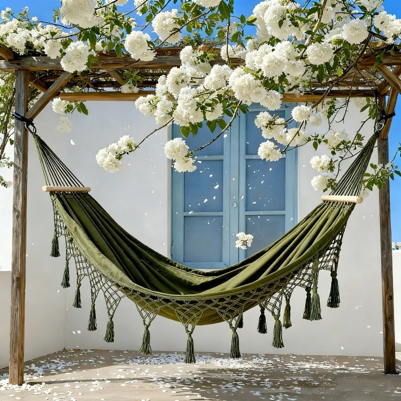 ��The handwoven cotton fringe detailing adds a relaxed, coastal-inspired aesthetic, while the neutral ivory tone blends effortlessly into balconies, patios, gardens, bedrooms, or sunrooms. Reinforced cotton ropes and a solid wooden spreader bar enhance stability and durability, making it suitable for single or double lounging.