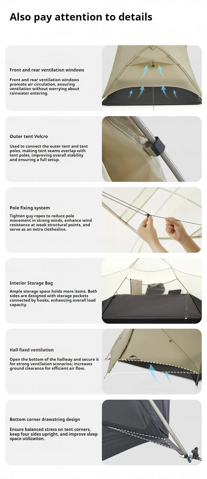 Smart Space Optimization: Designed for comfort and utility, the tent features an expandable canopy for extra sunshade, internal storage pockets connected by hooks, and a hall area (0.60��/1.21��) that can be opened for enhanced airflow. The bottom corner drawstring design keeps the tent upright and maximizes usable sleeping space.